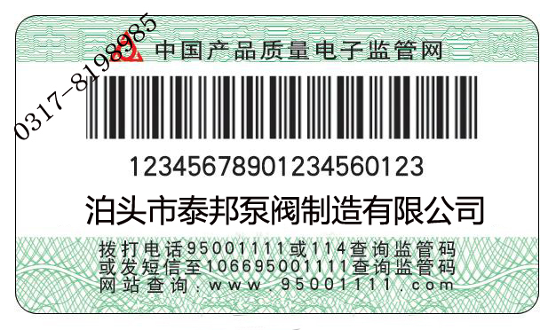 泊頭市泰邦泵閥制造有限公司自2006年12月1 日出廠的產(chǎn)品,在產(chǎn)品合格證上粘貼長方圓形監(jiān)管碼標(biāo)簽,上有20位數(shù)字,這就是產(chǎn)品監(jiān)管碼。因此,我公司生產(chǎn)的每件產(chǎn)品都將有一個(gè)“電子身份證”??梢岳霉潭娫?、手機(jī)短信、互聯(lián)網(wǎng)、超市終端等網(wǎng)絡(luò)通訊設(shè)備對(duì)電子監(jiān)管碼進(jìn)行查詢,辨別真?zhèn)?。查詢辦法如下: 1. 電話查詢: